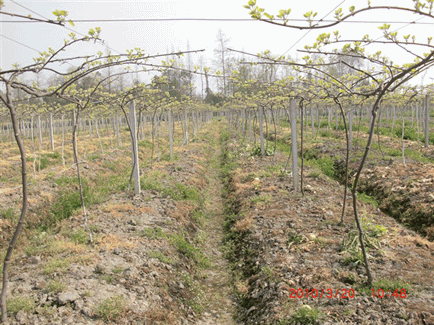圖為:獼猴桃示范種植園,已使用公司的土壤改良劑,樹(shù)枝發(fā)芽不錯(cuò)