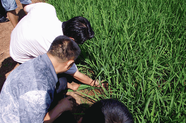 圖3:公司員工親自到稻田察看超級(jí)稻分蘗情況