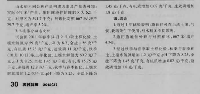 《農(nóng)村科技》2012年第3期 “施地佳”鹽堿土壤調(diào)理劑在水稻地施用效果