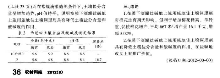 《新疆農(nóng)墾科技》2012年第8期 “施地佳”土壤調(diào)理劑在鹽堿地膜下滴灌棉田示范試驗(yàn)