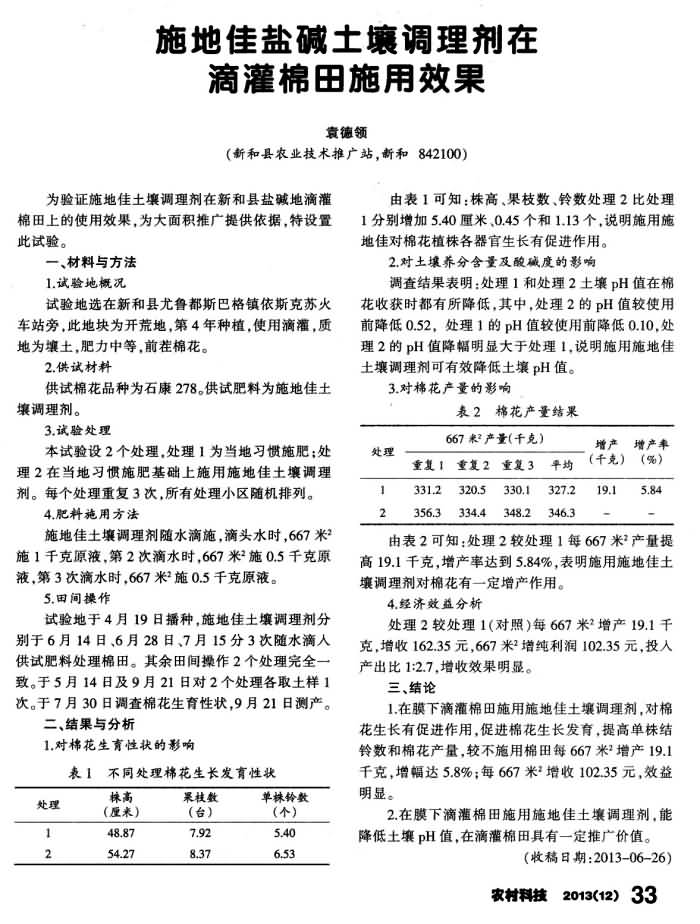 《農(nóng)村科技》2013年第12期 “施地佳”鹽堿土壤調(diào)理劑在滴灌棉田施用效果