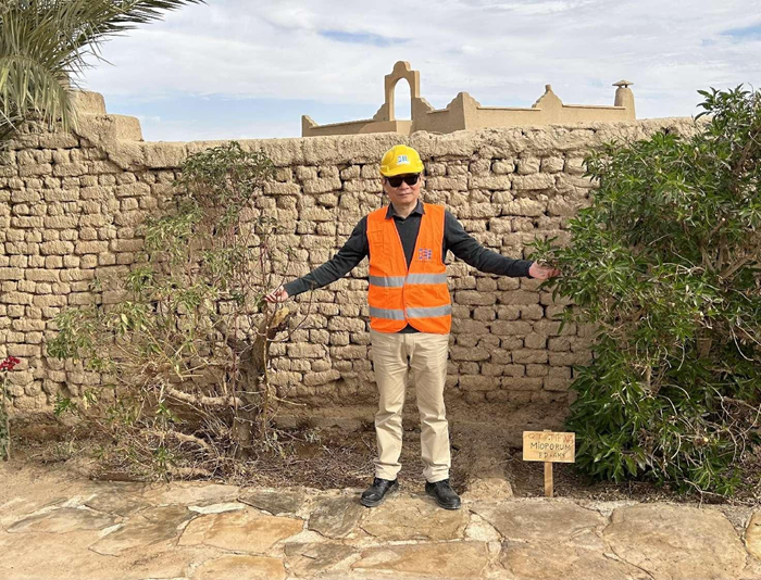 2022年11月25日下午王永葆會長在摩洛哥撒哈拉沙漠中的綠洲小鎮(zhèn)伊爾福德, “中非鹽水農(nóng)業(yè)示范農(nóng)場”改良土壤實(shí)驗(yàn)現(xiàn)場,在駐地旁這棵樹使用改良劑60天,與對照樹