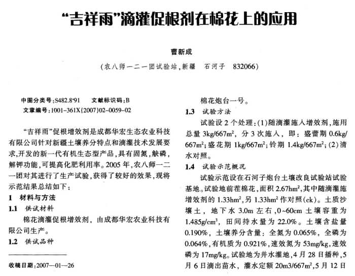 《新疆農(nóng)墾科技》2007年第2期 “吉祥雨”滴灌促根增效劑在棉花上的應(yīng)用